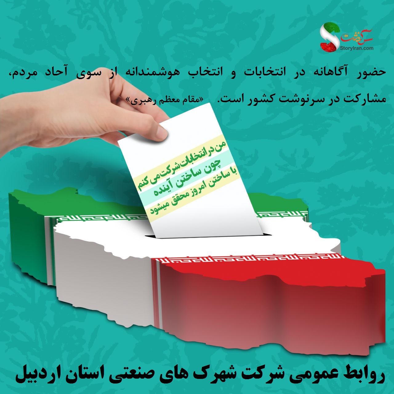 ما کارکنان شركت شهرك هاي صنعتي استان اردبيل همراه و همگام با سایر هموطنان در پای صندوق‌های رای حاضر خواهیم شد تا با این حضور گسترده، با آرمان‌های بلنـد بنـیان‌گـذار کبیـر انـقلاب اسـلامـی (ره) و مقـام معظـم رهبـری «مدظله العالی» تـجـدیـد میثاق نمائیم.
