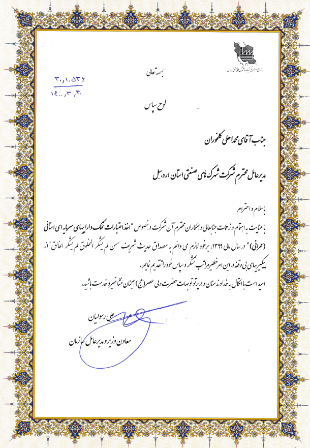 به گزارش روابط عمومی شرکت شهرک های صنعتی استان اردبیل، در این لوح سپاس که از سوی علی رسولیان معاون وزیر صمت و مدیرعامل سازمان صنایع کوچک و شهرک های صنعتی ایران صادر گردیده، آمده است: