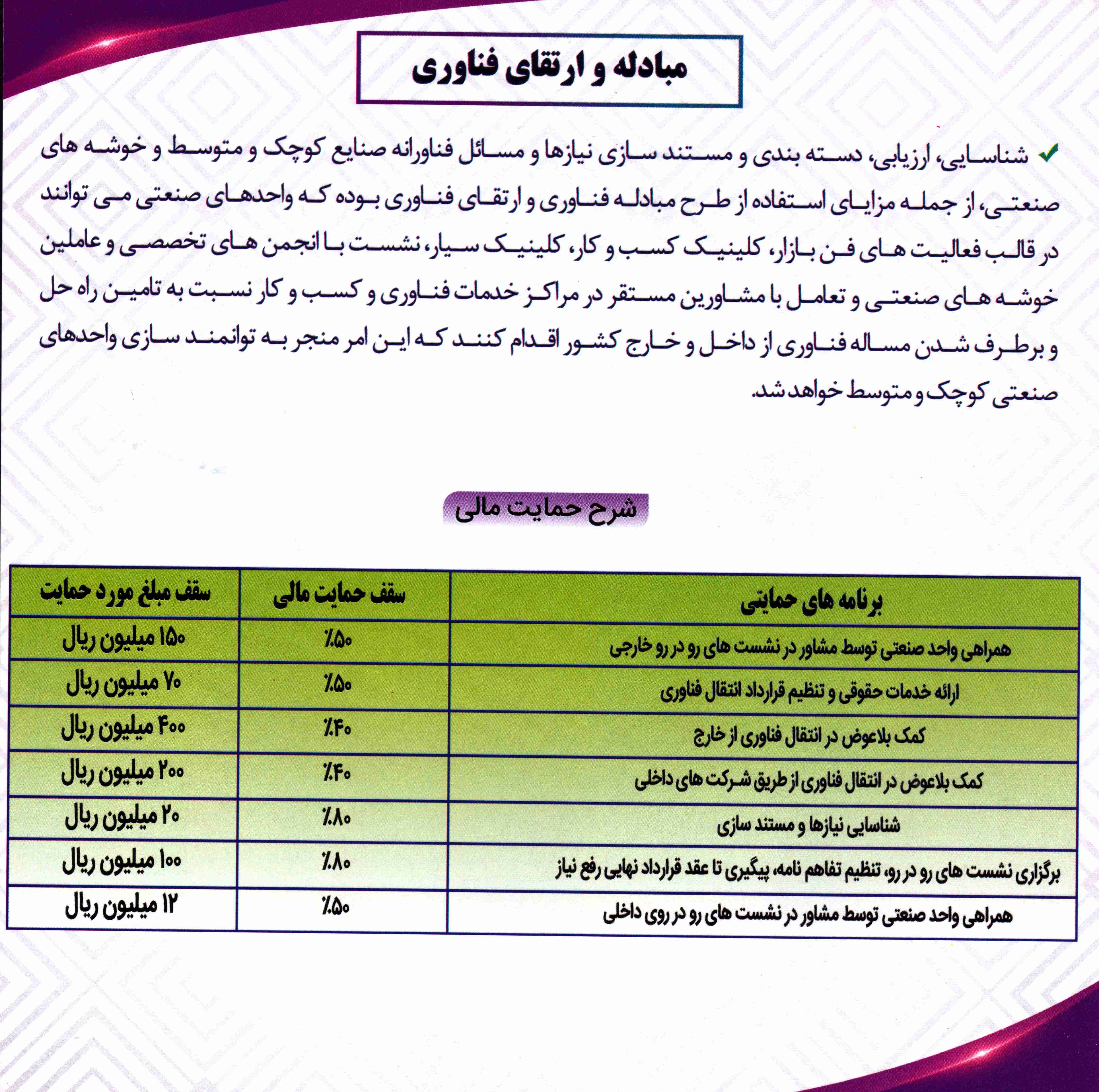 شناسایی، ارزیابی، دسته بندی و مستند سازی نیازها و مسائل فناورانه صنایع کوچک و متوسط و خوشه های صنعتی، از جمله مزایای استفاده از طرح مبادله فناوری و ارتقای فناوری بوده که واحدهای صنعتی می توانند در قالب فعالیت های فن بازار، کلینیک کسب و کار، کلینیک سیار، نشست با انجمن های تخصصی و عاملین خوشه های صنعتی و تعامل با مشاورین مستقر در مراکز خدمات فناوری و کسب و کار نسبت به تامین راه حل و برطرف شدن مساله فناوری از داخل و خارج کشور اقدام کنند که این امر منجر به توانمند سازی واحدهای صنعتی کوچک و متوسط خواهد شد.